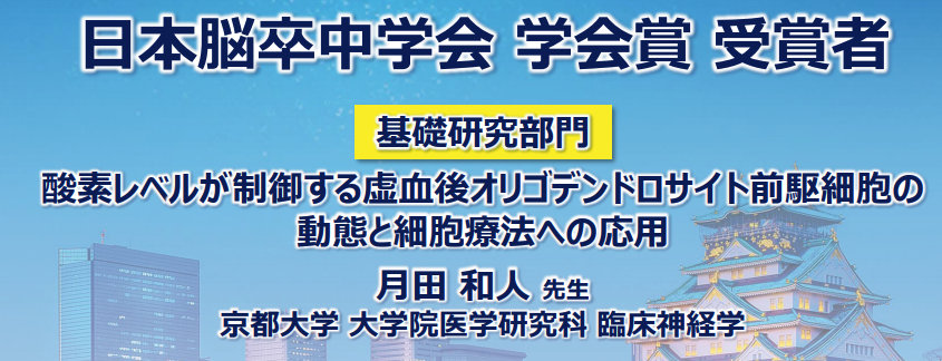 当科特定講師の月田和人先生が、2026年3月12〜14日まで大阪国際会議場で開催されましたStroke2026にて、日本脳卒中学会学会賞[基礎研究部門]を受賞されました。本演題は、脳卒中グループ(グループリーダー:眞木 崇州 講師)と共同で行なっている研究成果を発表したものであり、「オリゴデンドロサイト前駆細胞が脳卒中後酸素レベルに応じて役割を切り替え、急性期は血管再生、慢性期は再ミエリン化を担う“状況適応型細胞”であることを、単細胞RNAシーケンス(scRNA-seq)のメタアナリシスにより詳細に特徴づけた」ものであります。おめでとうございます!
