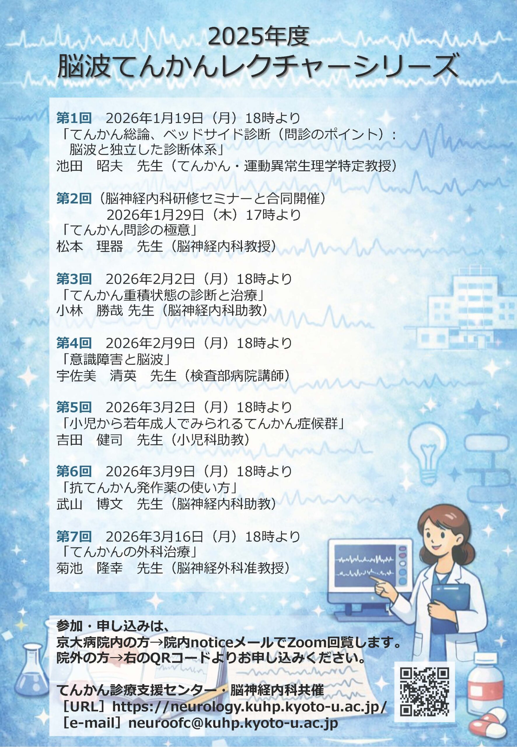 - 第1回 てんかん問診の極意(第2回脳波てんかんレクチャーシリーズを兼ねています)講師:松本 理器:京都大学脳神経内科教授日時:2026年1月29日(木)17:00~18:00